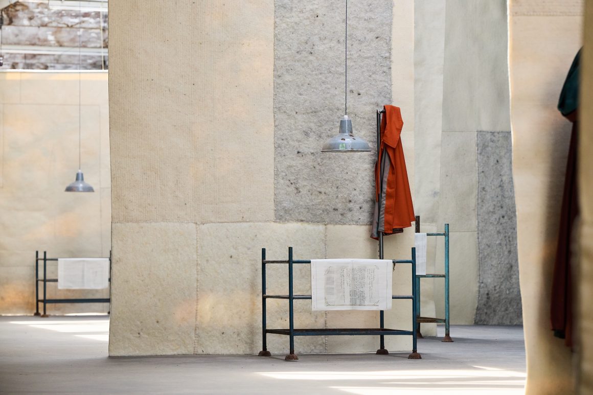 Drawing on the origins of the textile processes that once filled the huge space and working with artefacts from the Mill, Hamilton’s installation brings together song, printed word, cloth, raw and woven wool. The textiles are sourced from local companies in Bradford, including H Dawson, founded in 1888 and now based at Salts Mill, and William Halstead, which this year celebrates its 150th anniversary.
