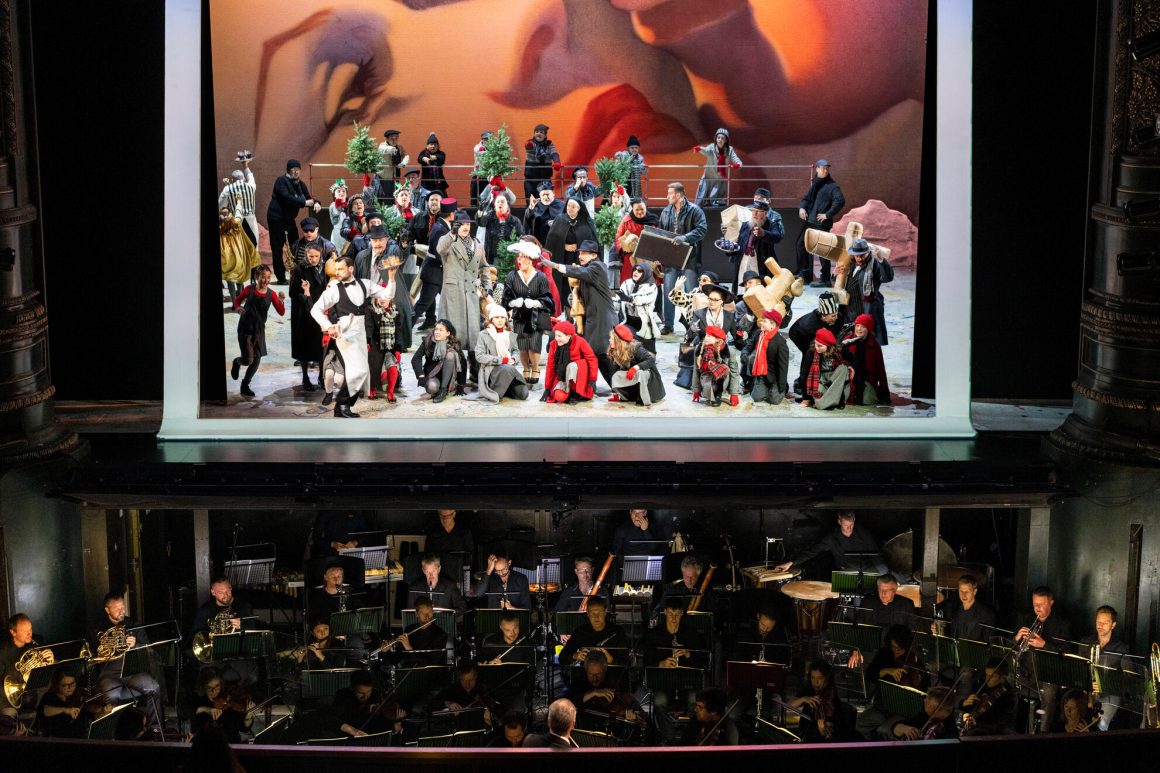 Main image – Opera North’s production of Puccini’s La bohème. Han Kim as Colline, Seán Boylan as Schaunard and Elin Pritchard as Musetta, with members of the Chorus of Opera North.