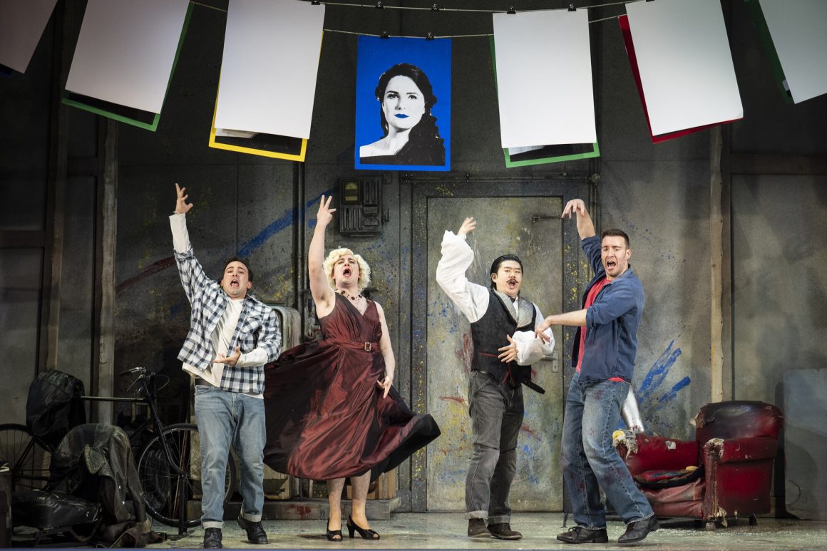 To refresh your memory of the bare bones of a relatively straightforward story, it is about four struggling bohemians – a poet, a painter, a musician and a philosopher. They live together, shivering and slapsticking around in a starkly bare, freezing cold room in Paris just before Christmas, and they are all male; this is more than one and a half centuries ago, so their female versions either did not exist or did not get written about.