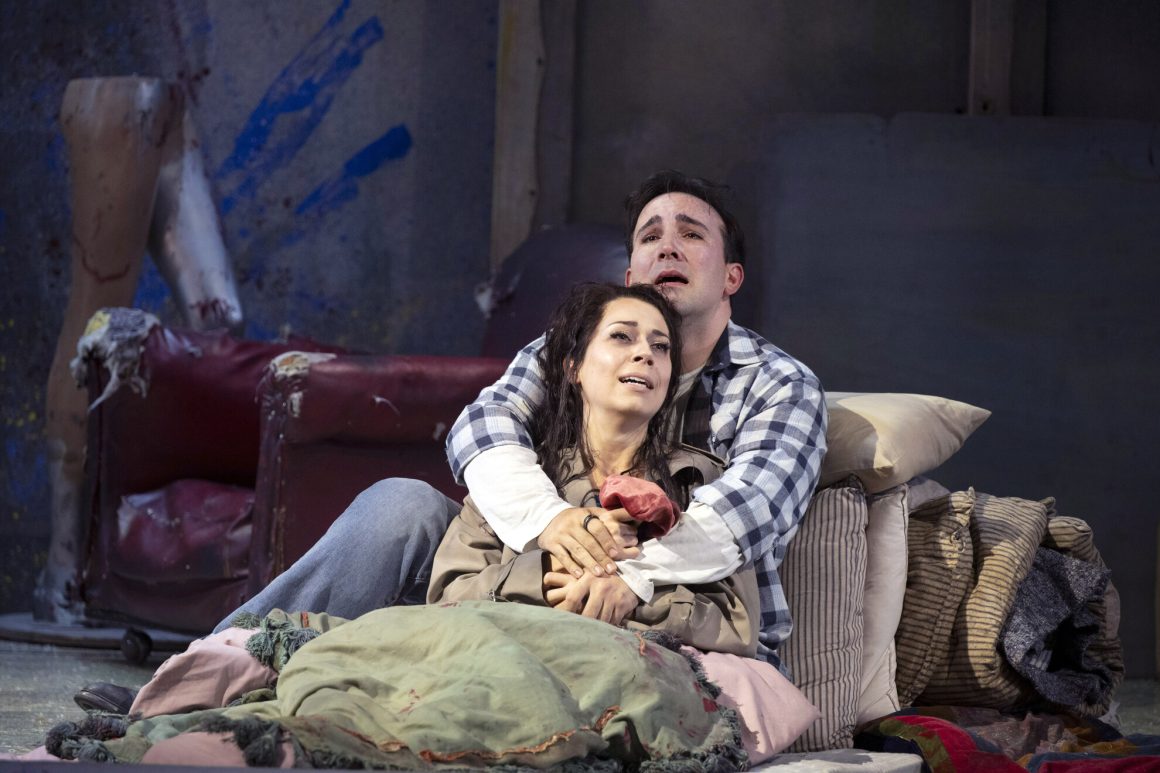 Baritone Yuriy Yurchuk as Marcello had a forceful lyrical presence, his rich voice complementing that of soprano Elin Pritchard very well. She played his flirty and dramatic lover Musetta, and was impressive as she manipulated the emotions of both him and her creepy rich suitor Alcindoro in the Café Momus. Her aria Quando m’en vo (When I go out) was a tour de force as she swagger-waltzed through the café trying to get Marcello’s attention.