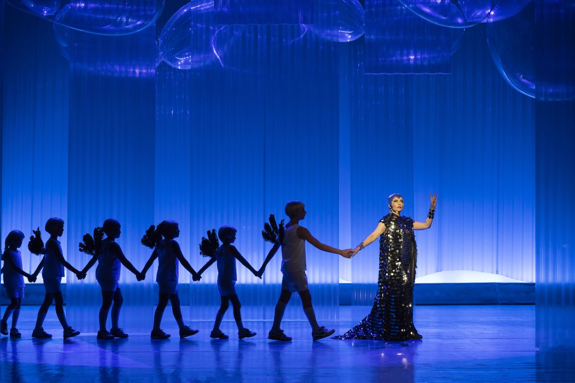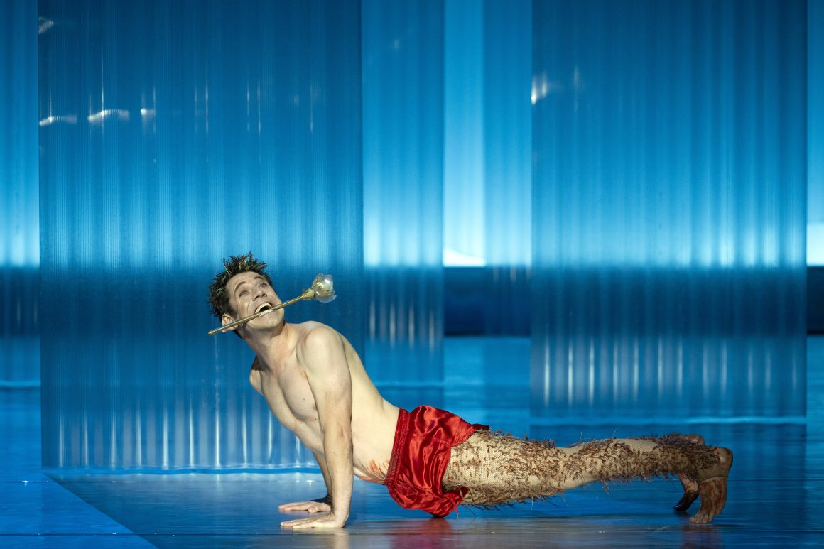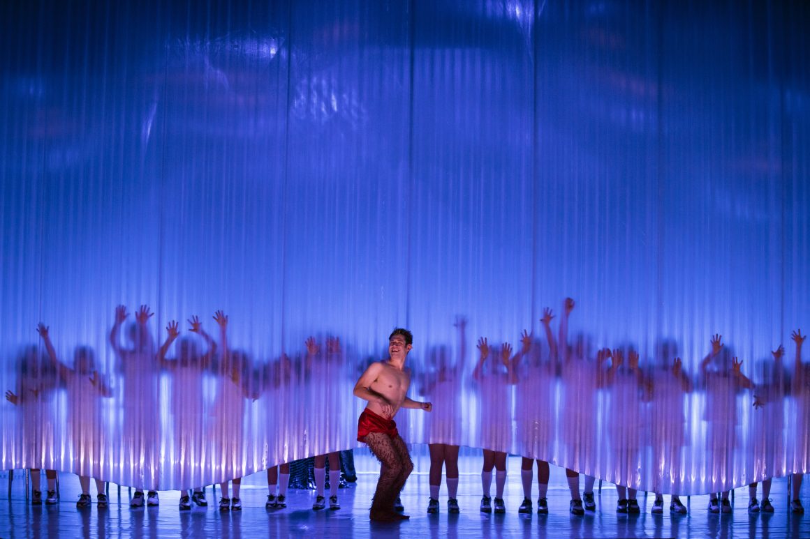 Johan Engels‘ remarkable set of lofty balloon canopy and corrugated perspex uprights is figuratively arboreal, yet transformed at curtain up from shrouded, mystical aether to the drama’s enchanted wood by Bruno Poet‘s magical lighting.