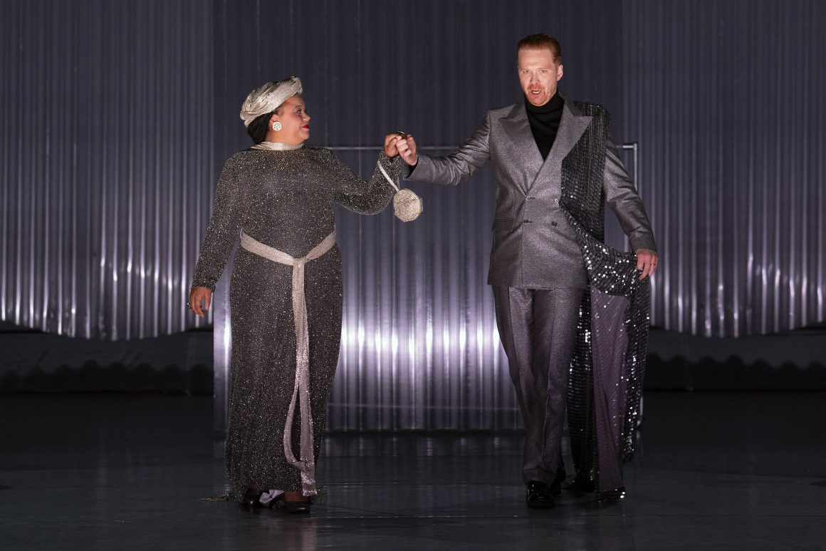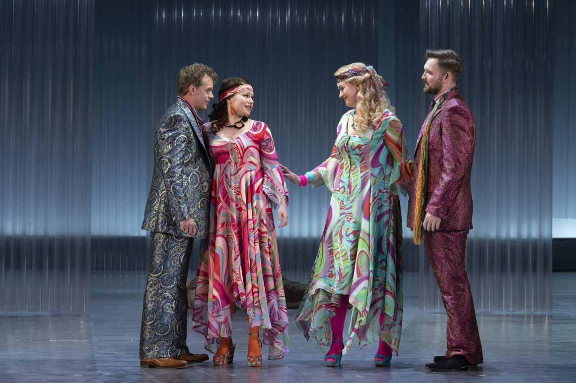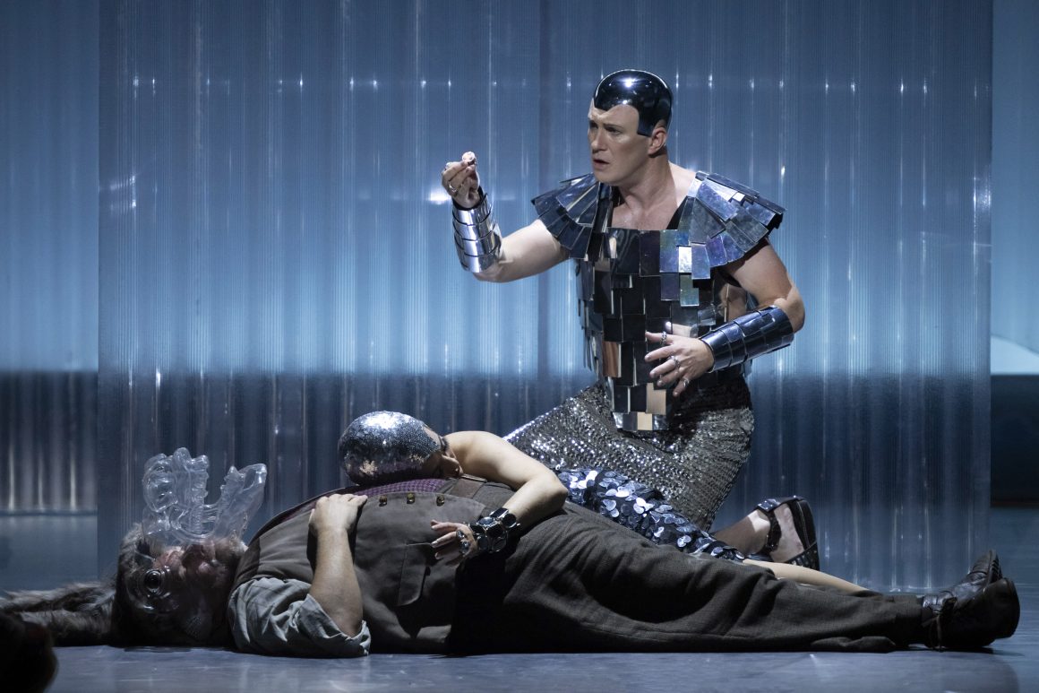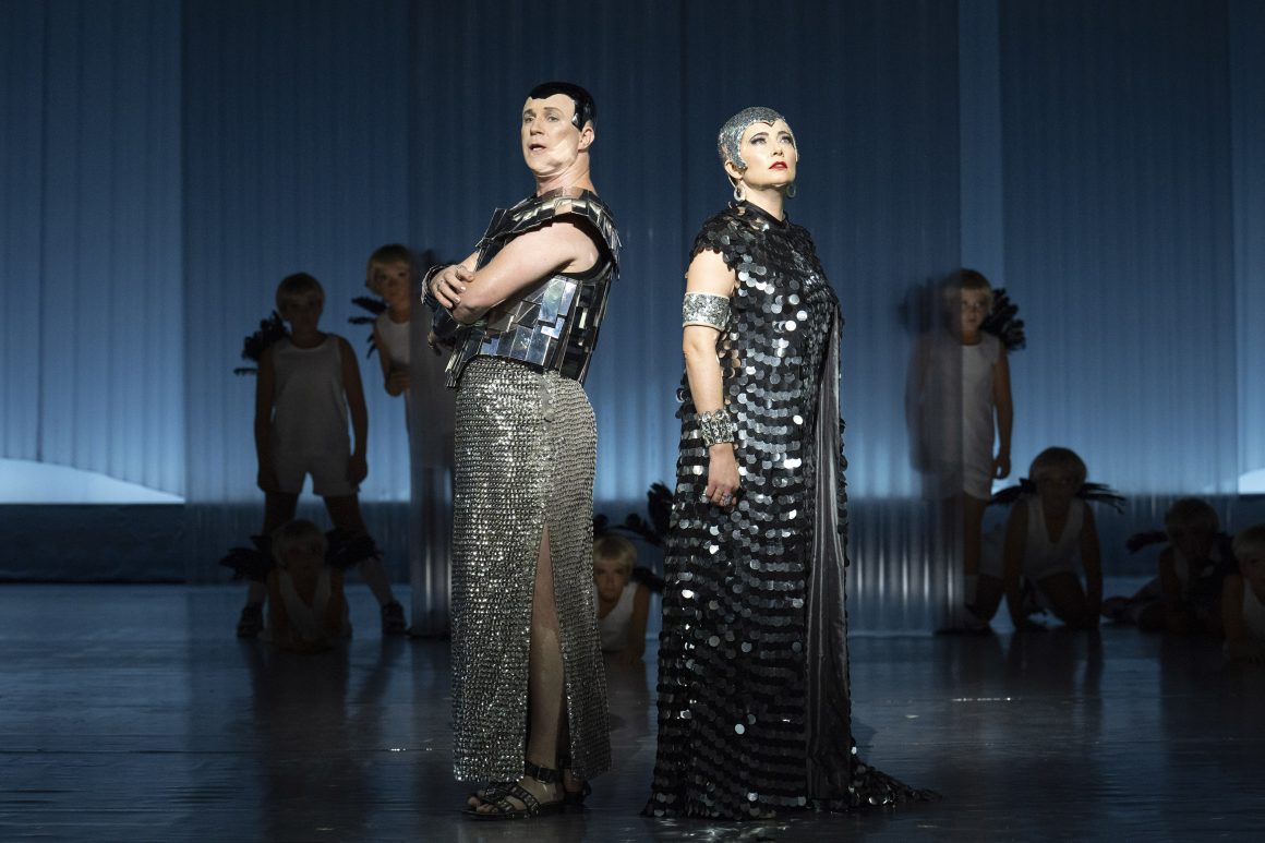 Johan Engels‘ remarkable set of lofty balloon canopy and corrugated perspex uprights is figuratively arboreal, yet transformed at curtain up from shrouded, mystical aether to the drama’s enchanted wood by Bruno Poet‘s magical lighting.