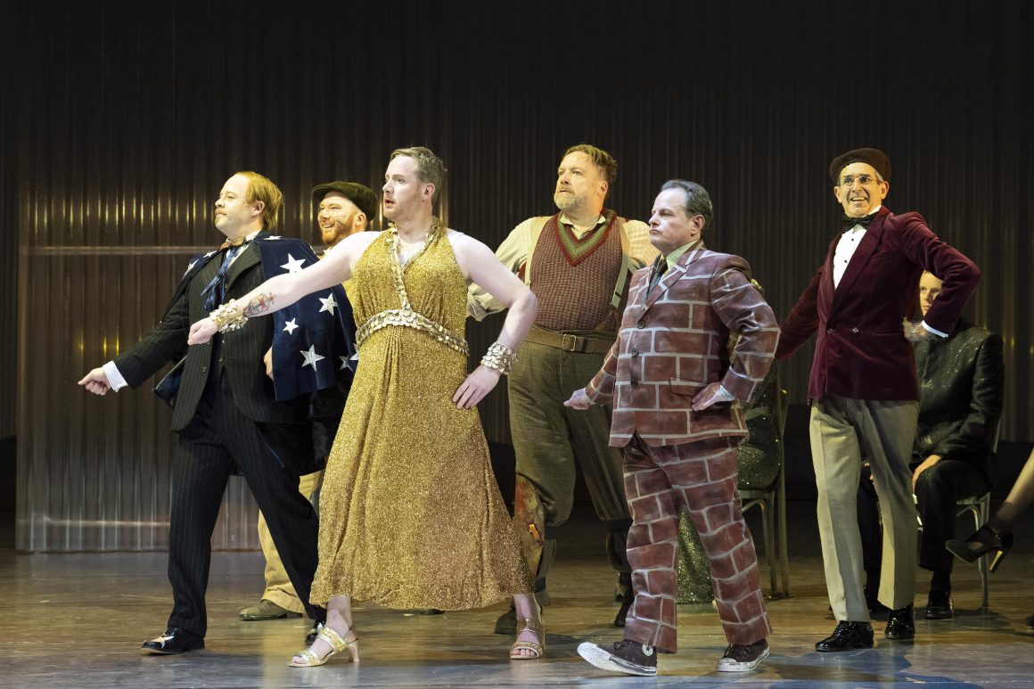 Bedecked similarly in glittering metallic sequins, Daisy Brown‘s dignified and lyrical Tytania (Britten’s spelling) is altogether less androgynous and vocally befittingly warmer and beguiling. She is assigned some treacherously angular melodic lines in her quarrels with Oberon, which she negotiates with much distinction, and there is an endearing kindness and geniality about her guardianship of the fairy youngsters. Her potion-induced romantic encounter with Bottom-turned-ass, a honeyed little waltz song, is tenderly suffused with a touching pathos, by which we might all like our ears caressed.