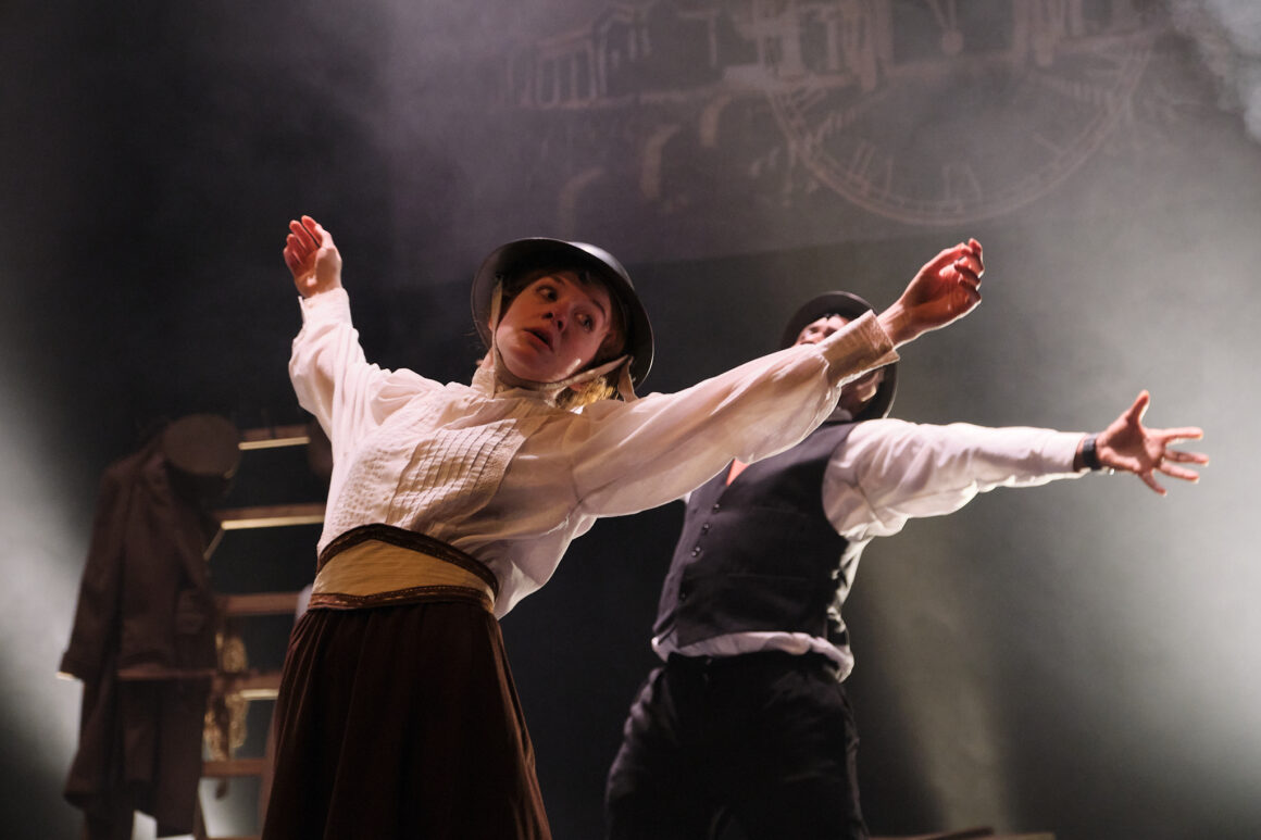 At Leeds Playhouse, Our Little Hour was performed on a sparse stage with a black curtains overhung with a greenish sepia-toned textile banner, depicting a graveyard and a clock striking 11 o’clock. This kept Armistice Day and the remembrance of fallen soldiers in the forefront of our minds throughout the show.