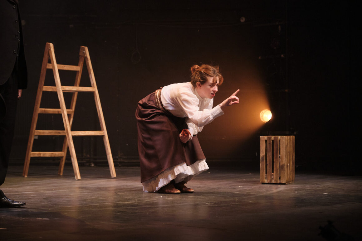 With minimal props and set design but working with a huge number of roles, supporting actors – Geebs Marie Williams and Neil Reidman – used movement and voice masterfully to shift from one character to the next. After the show, Geebs described how much she loved muli-roling, saying that it was “challenging but really, really fun,” and saying that she allowed each character to lead with their body, enabling her to inhabit a wide range of characters, including a football fan on the terraces and a commanding army officer.