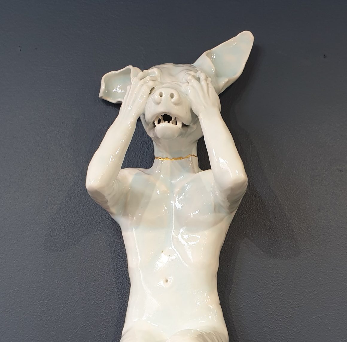 Again, in ‘La primera vez que te conocí’ (‘The first time I met you’) it is the title of Cortes’ work that unlocks the depth of her sculpture. This is no surprise, given Corte sees her work as closely linked to her writing, there often being a short story inspiring her sculpture or vice-versa. In this sculpture, a body, reminiscent to that of Christ’s, is pinned to the wall. At the top of the body sits a dog’s head with his eyes