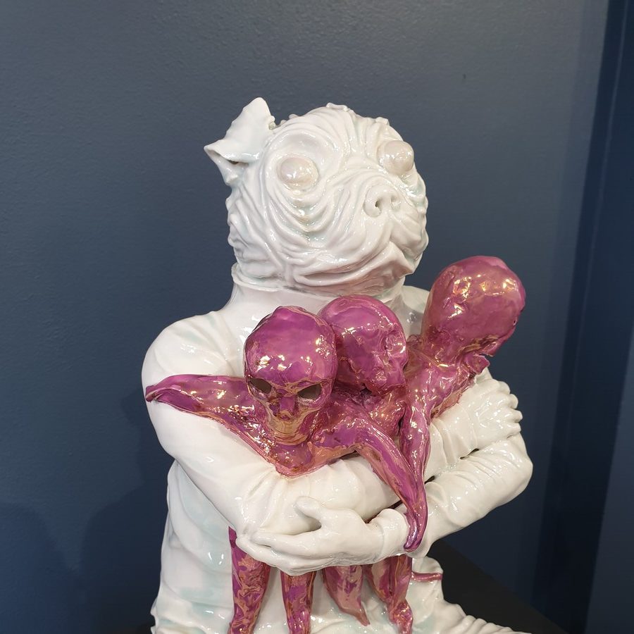 Many of these sculptures focus on the body and the disturbance it undergoes during day-to-day interactions. ‘Collecting Bad Friendships’ depicts a man clutching three pink aliens, his face wrinkled to that of a dog, his eyes glazed over and vacant, as though bad friendships act to devoid him of himself, even as he clings to them. But it is not just his body that is transformed – the bad friends he is collecting are shown to be leaking in blue down his torso, as though it is the ‘bad friends’ who are suffering from the subjugation of being ‘collected’. The power dynamics found in the normality of friendship are being challenged.