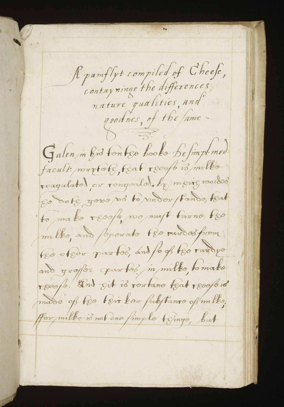 ‘A pamflyt compiled of Cheese, contayninge the differences, nature, qualities, and goodnes, of the same’ was unpublished and unknown until it surfaced at auction in 2023 and was acquired by the University with the support of a grant from Friends of the Nation’s Libraries. The 112-page vellum- bound manuscript is thought to date from the 1580s.