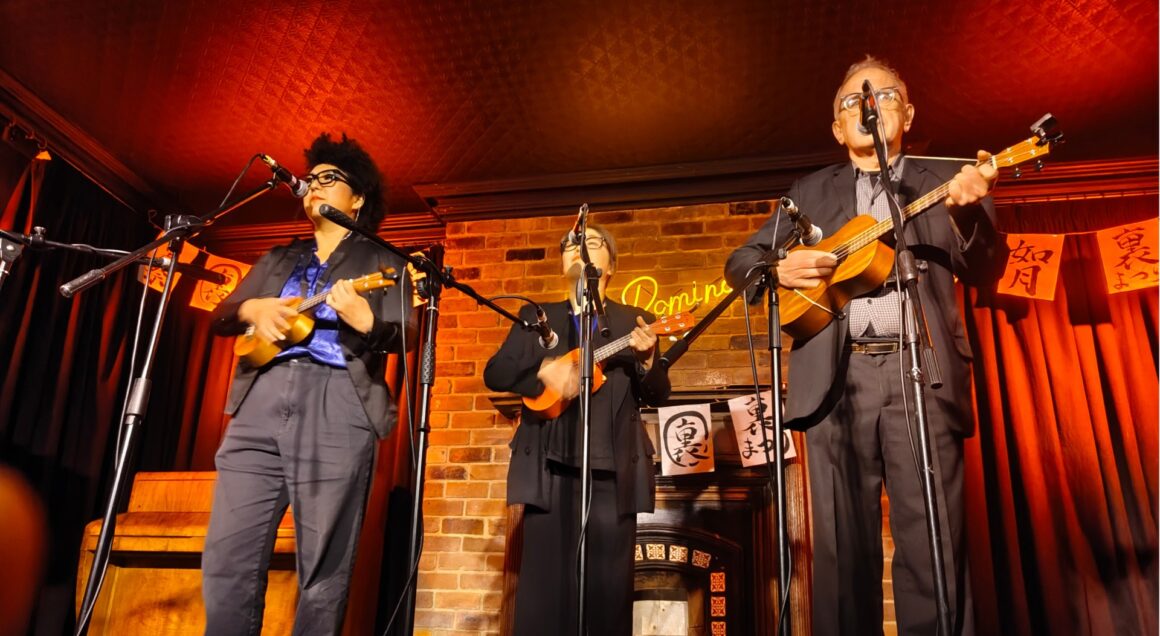 The variety show began with a welcome from ‘Japan-A-Gran,’ the hostess for the evening, who encouraged the audience to read cards introducing each act and carried a basket of sweets to reward this hard work. First, a trio of ukulele players – the Yokoleles – took to the stage to perform a short set of Japanese ‘golden oldies’. One player was rumoured to be Andy Cox, guitarist from The Beat and Fine Young Cannibals, part of an ongoing theme throughout the night of blurring lines between past and present, folk and pop, Japanese and British culture.