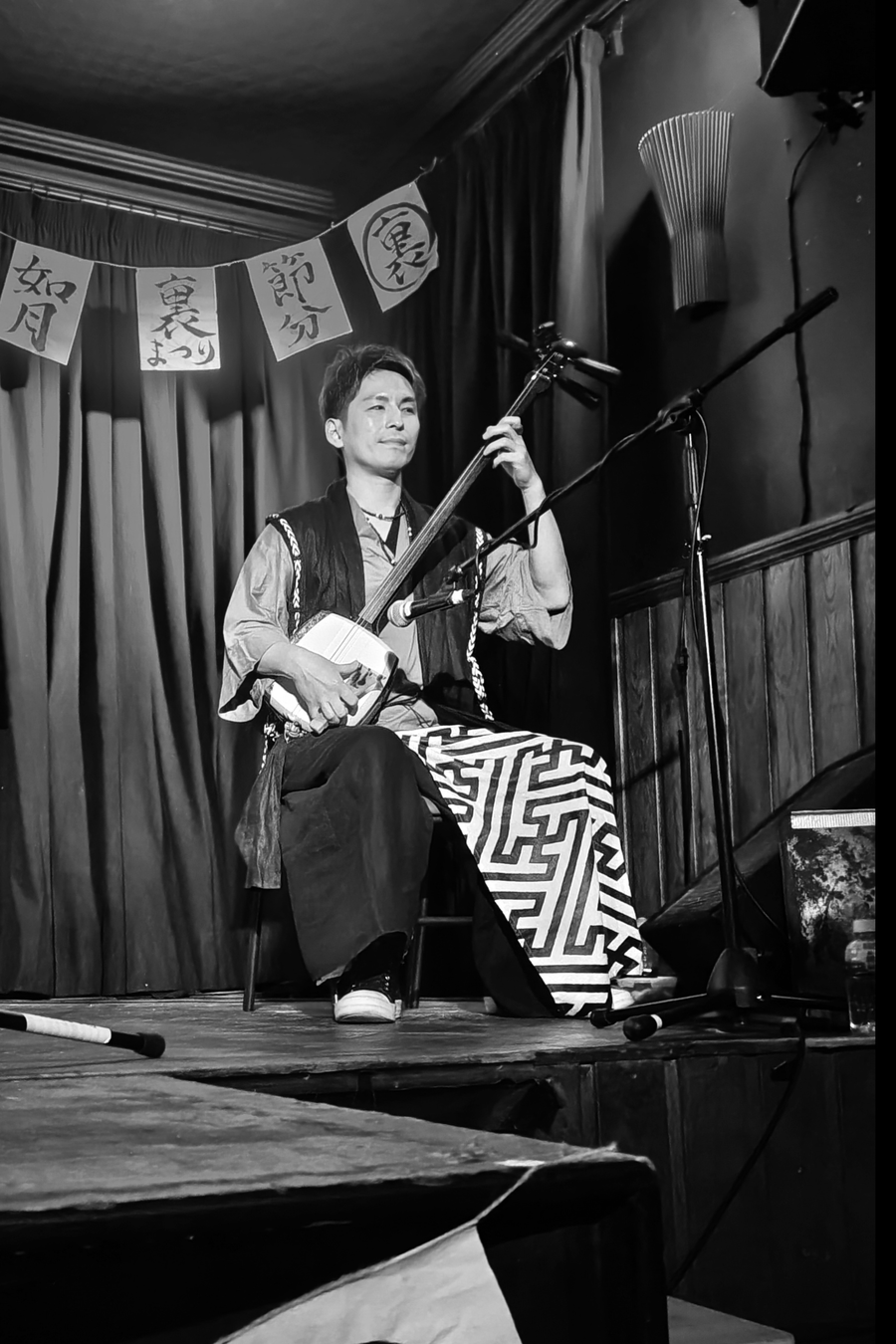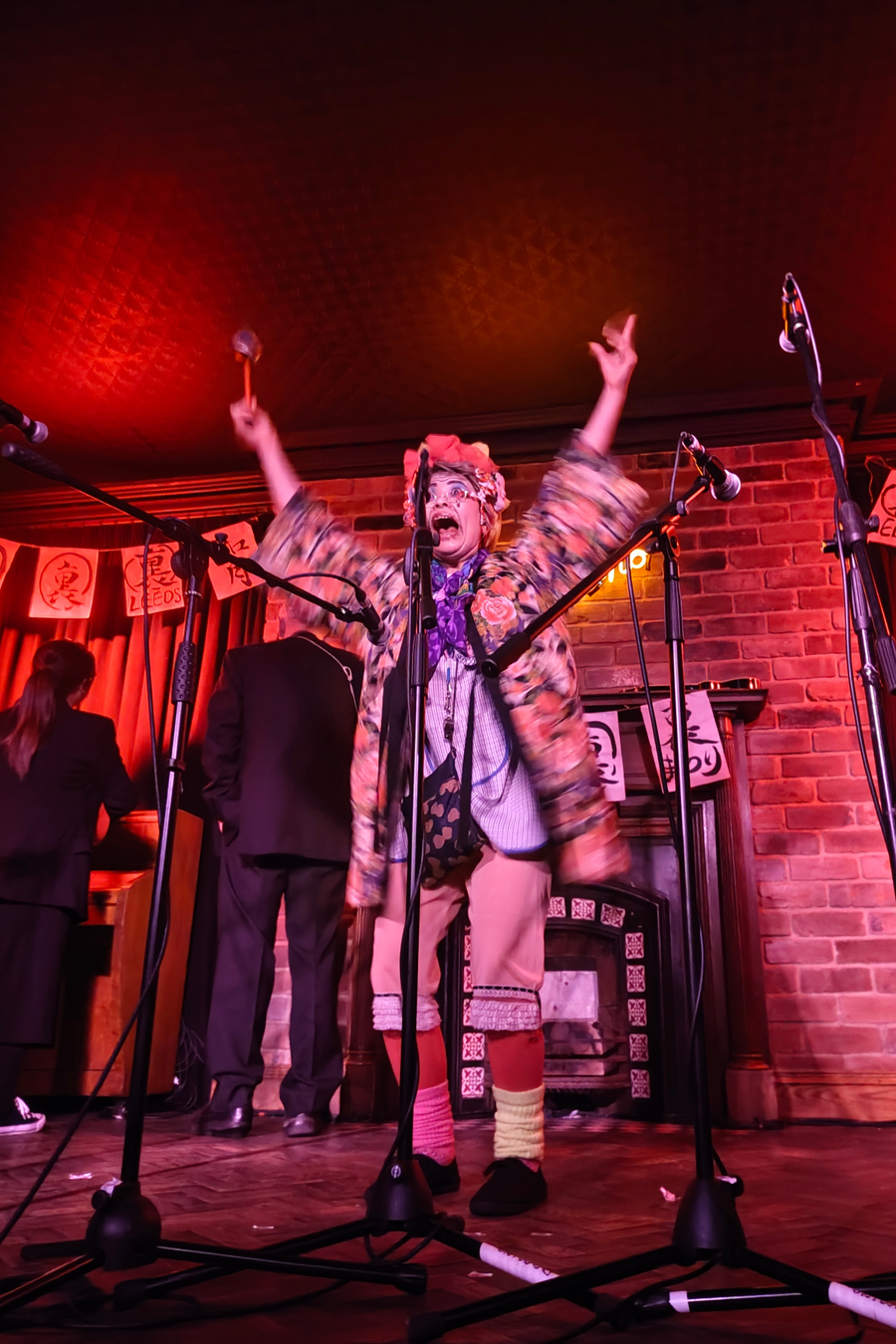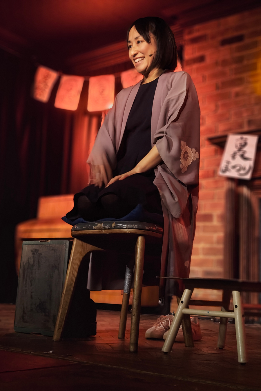 The music was quickly followed by Tomoko Komura, who shared a story passed down through generations called A Tale of a Tub Maker in the centuries-old rakugo style. This approach involves one performer telling long stories with many characters, using great energy and exaggerated expression… and Tomoko didn’t disappoint. As this form of storytelling uses minimal props – in this case, a map of Japan – extra tension was built by asking a member of the audience (Jared from York) to beat a rhythm on a box. This simple approach helped bridge the already small divide between the low stage and the audience, creating a sense of connection and togetherness, preparing them for a deeper dive into Japanese folk music.