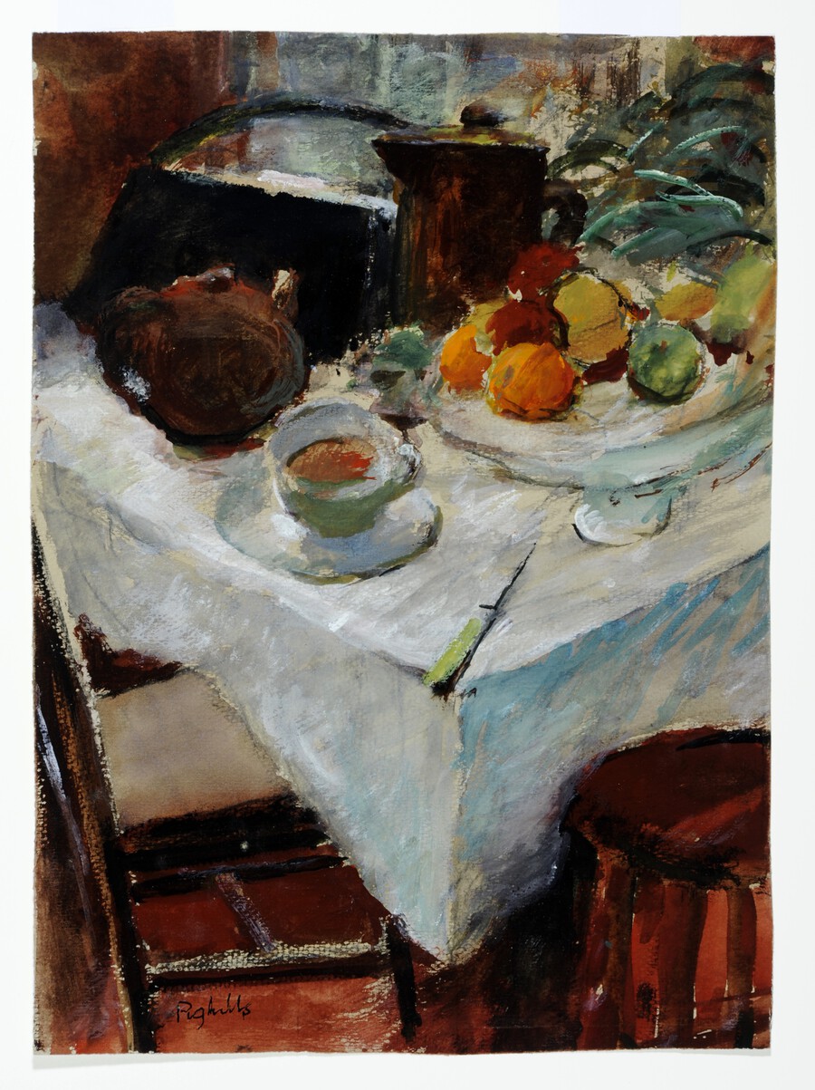 Beth Smith’s Comfort Food (1990) and Joseph Pighills’ Still Life (undated) take us into homes to view tables laden with food and crockery.