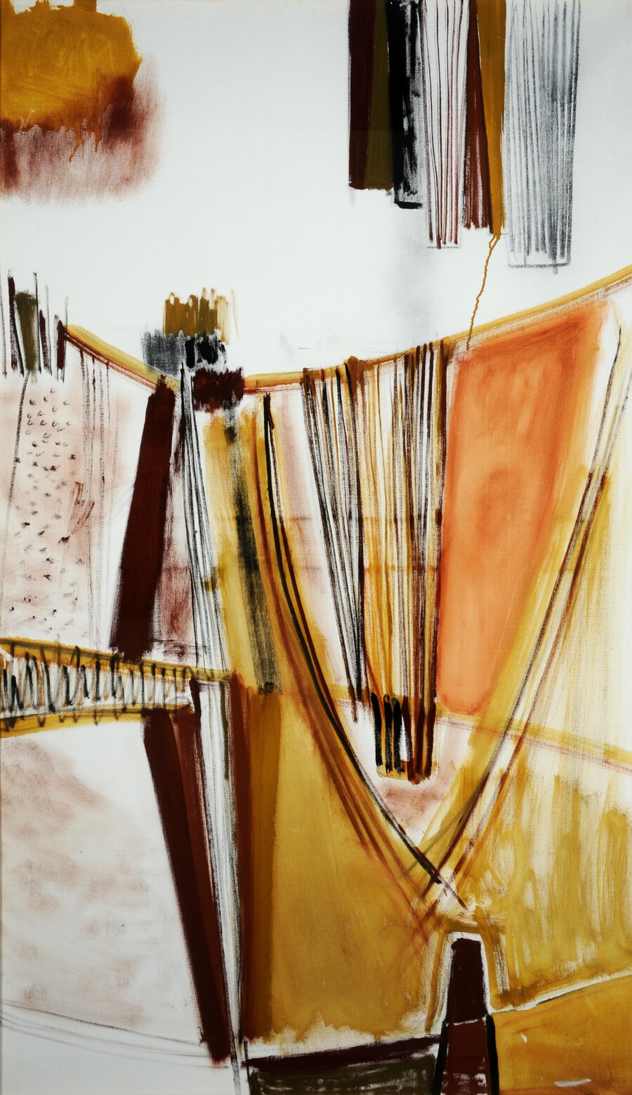 Terry Frost painted Mars Red, Yellow and Brown in the autumn of 1957, three years after moving to Leeds to take up the role of Gregory Fellow in painting at the University. He embraced tall canvases and plunging forms over the course of his time here. This new vertical emphasis was derived in part from the patterns of stone walls running up the hillsides of the Yorkshire Dales, and in part from his experience of sledging downhill in Roundhay Park. Exposure to the Yorkshire landscape also changed Frost’s palette.