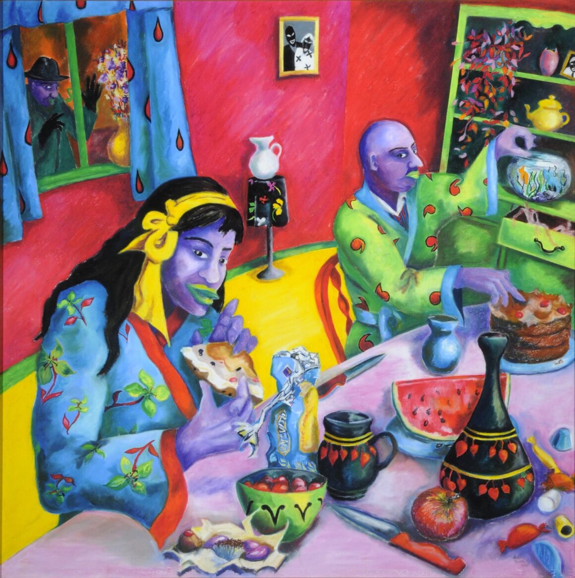 The work of Beth Smith (b.1961) is often humorous and serious at the same time. In Comfort Food, bright colours and playful characters are tempered by an undercurrent of uncertainty and menace – the large knives on the table, the gloved figure at the window.