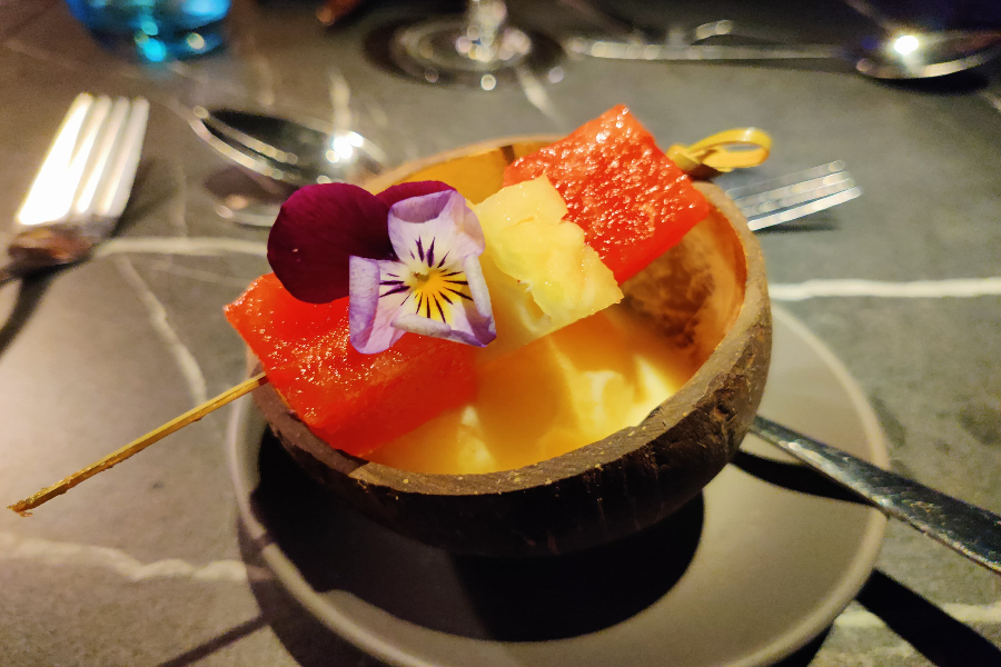 A passion fruit pina colada sorbet, served in half a coconut, is a bit of fun as a palette cleanser, before a big beast of a main course.