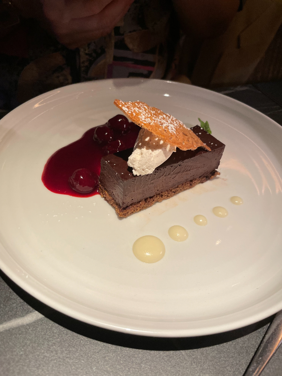 After such a heavy main course, neither of us is capable of making much headway through the dessert: a chocolate and hazelnut delice with morello cherry compote and white chocolate gel. As with all of the dishes, it’s well presented, but it’s a big and heavy thing and neither of us feels inclined to give it too much of our attention. (Ed’s Note: I promise I would have given it my full attention. Just saying.)