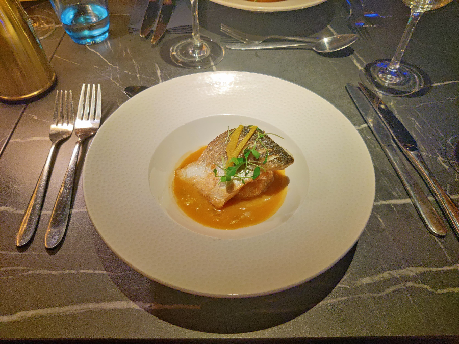 Our starter of seared seabass, perched on top of a butternut squash risotto cake adrift in a sea of a Thai coconut broth is potentially the highlight of the evening. The pickled ginger cuts across the richness of the sauce nicely, the fish is well-cooked and the fried risotto ball adds texture: it’s a very nice bit of cooking.
