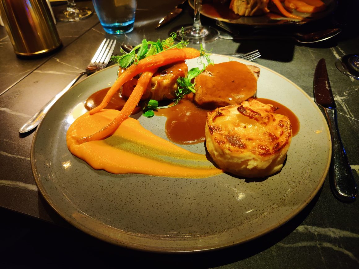 We are each presented with a beef fillet, a Wellington of beef shin and vegetables, dauphinoise potatoes, a carrot puree and a ruby port jus. This is a groaning plate of heavy-hitting crowdpleasers; a bit like something that might be served at a wedding to appeal to all tastes and to line stomachs. My steak is cooked well but my companion’s steak has been given a little bit too long in the pan.