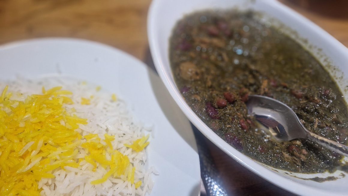 For mains we chose one kebab dish and one stew. Our server told us that the menu is changing to include more mixed kebab dishes. There is currently a mixed grill, but it is enormous, costs £49 and could feed three. For now, we added a stick of lamb kooobideh to the chicken kebab, a good move but it did increase the price to £20. The ghormeh sabzi we ordered was a traditional stew of lamb, dried lime, and kidney beans.