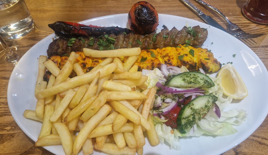 The kebabs were perfectly grilled. There is clearly a good charcoal grill in the kitchen and an expert griller. The chicken was well marinated, the outside slightly charred, the inside soft and moist. The koobideh was well seasoned and gently grilled. The kebabs came with side salad, fries, and a whole grilled fresh red chilli.