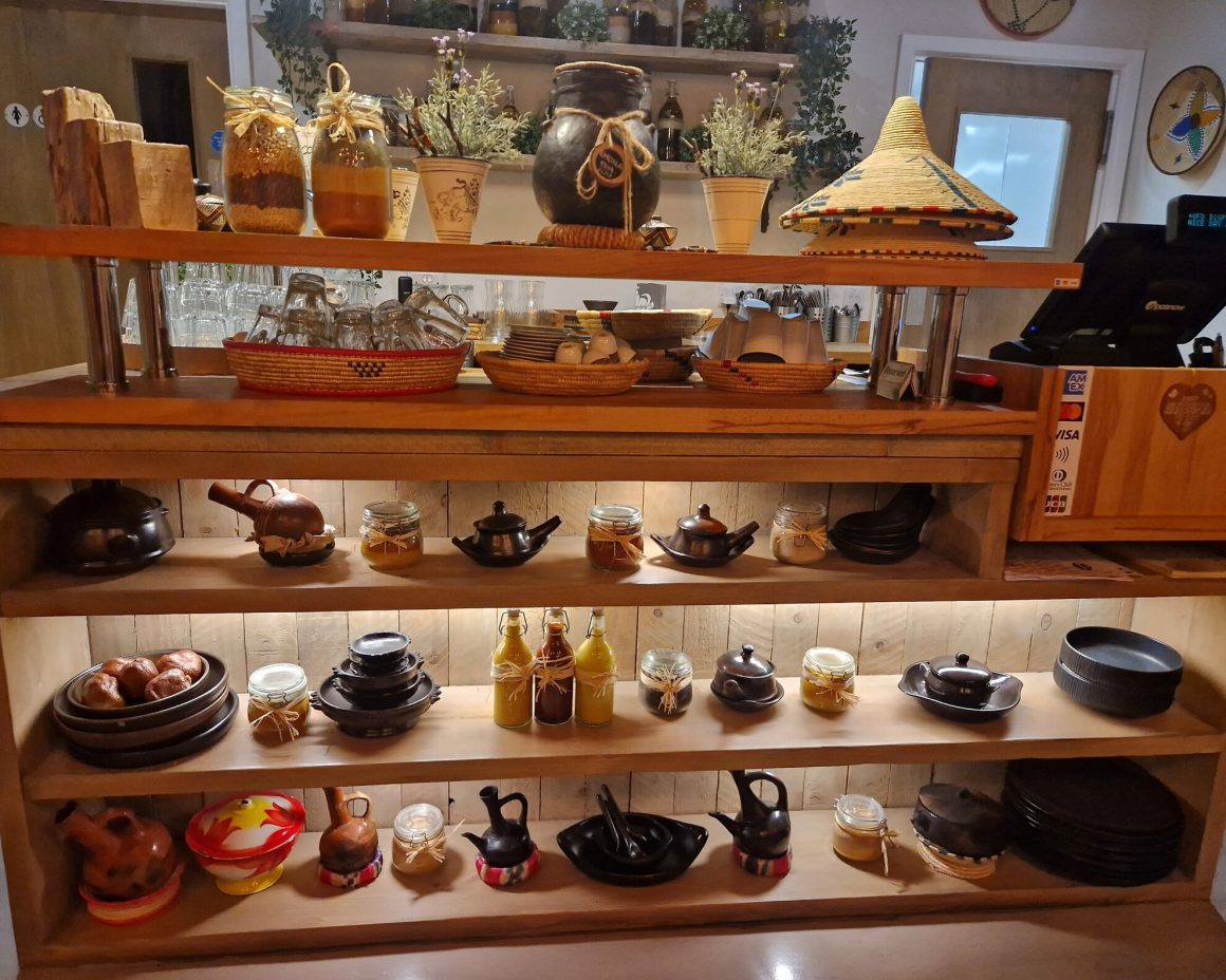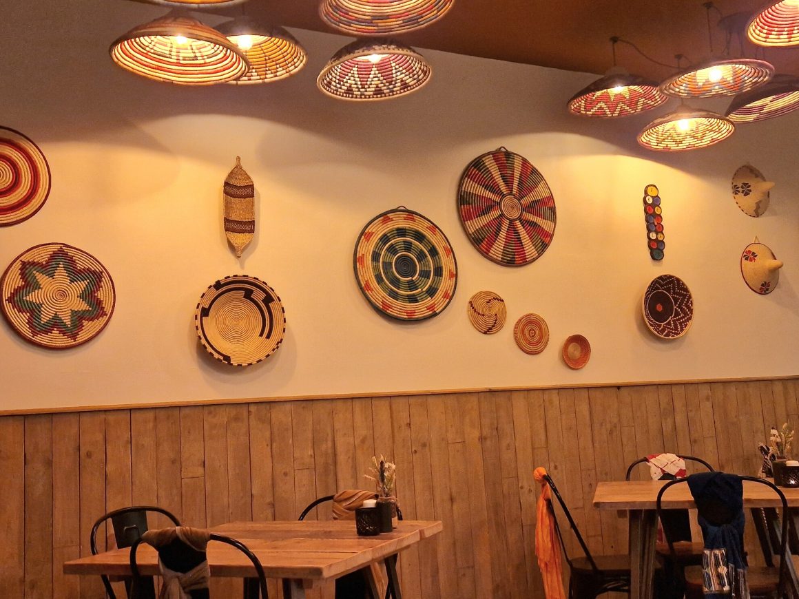 When we visited the small city centre restaurant on a Wednesday evening, three tables were occupied. If you want to come at the weekend, you will need to book. The space is bright, spotlessly clean and decorated with woven African platters and lampshades. The counter has a display of spices, including Ethiopian Cardamom or false cardamom, also known as Corarima.