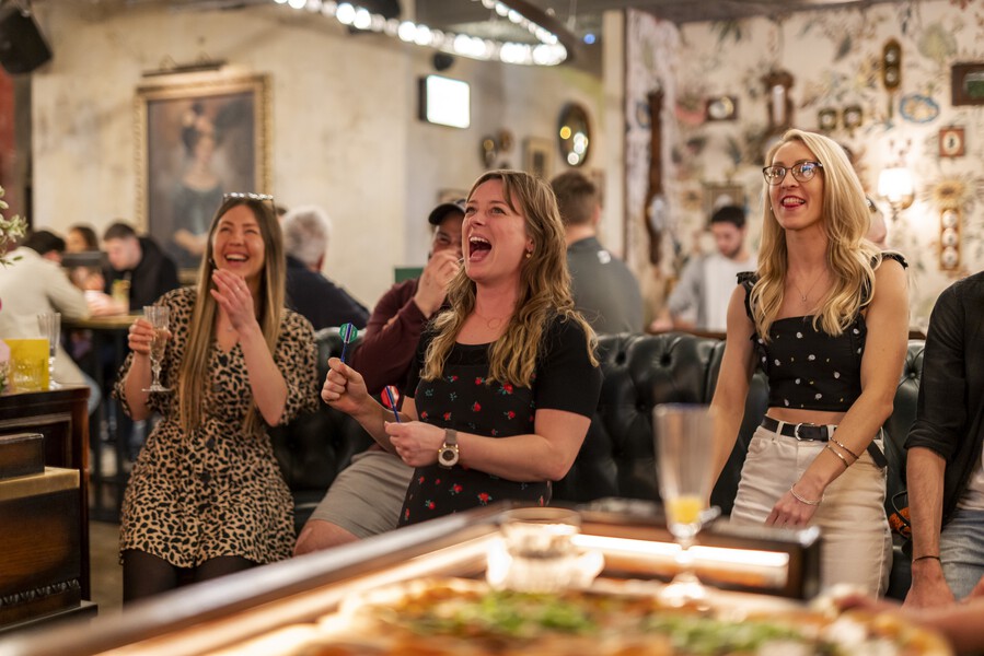 Flight Club’s story began in a Devon pub when childhood friends Steve Moore and Paul Barham saw a group of people going wild over a game of darts. This wasn’t like traditional darts, though; it was fun, fast and exciting. It was a light-bulb moment. This sparked a vision: to reimagine the traditional pub game for a new generation. They wanted to turn it into something where friends, family and colleagues could get together for a spectacular experience, combining friendly competition with delicious food and cocktails in a vibrant fairground-inspired bar setting.