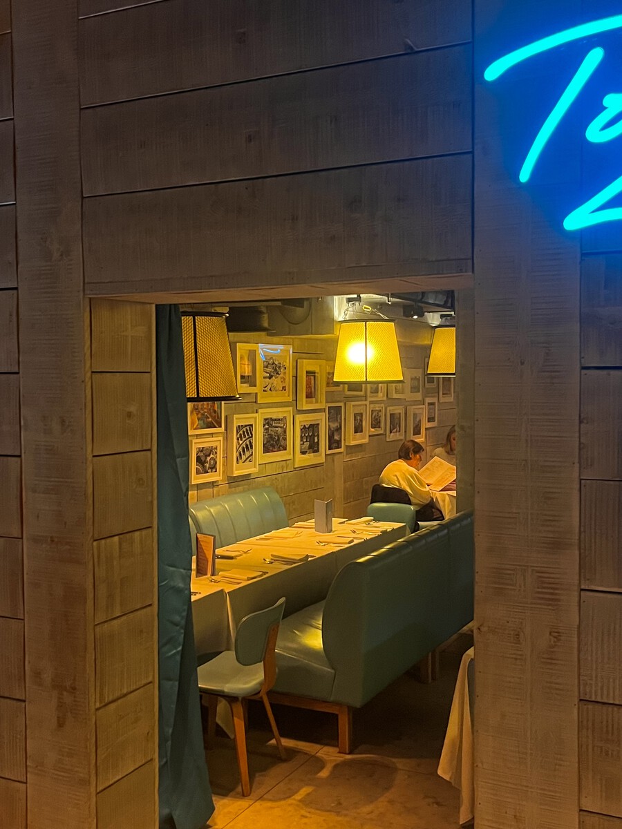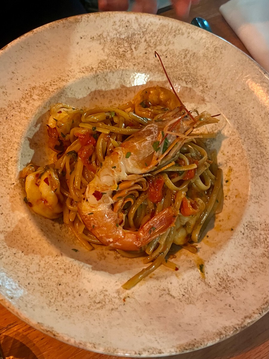 We arrived at peak hustle and bustle – around half past seven on a Saturday evening – and the smell of fresh dough was both immediate and mouth- watering. Glistening plates piled high with pasta and fresh seafood zipped past and the bar was alive with activity. If you fancy a spot of people watching, the neat tables of two by the window provide the perfect opportunity, but for an intimate date I would highly recommend booking their downstairs dining section, defined by sultry accents which practically scream “buy me a dessert then take me home”.