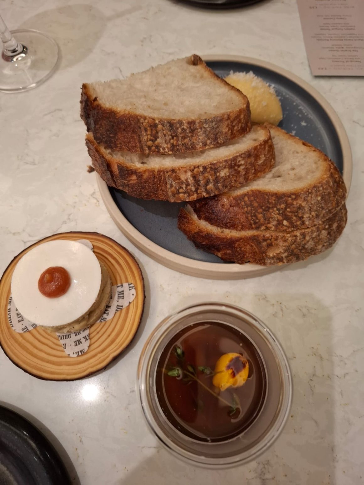 Our first course was named ‘We’re all mad here’, which was a Chicken Fat Doughnut with Roast Chicken Juices. Forgive the missing image. Instead, here’s what the appetiser (‘snacks’) looked like: