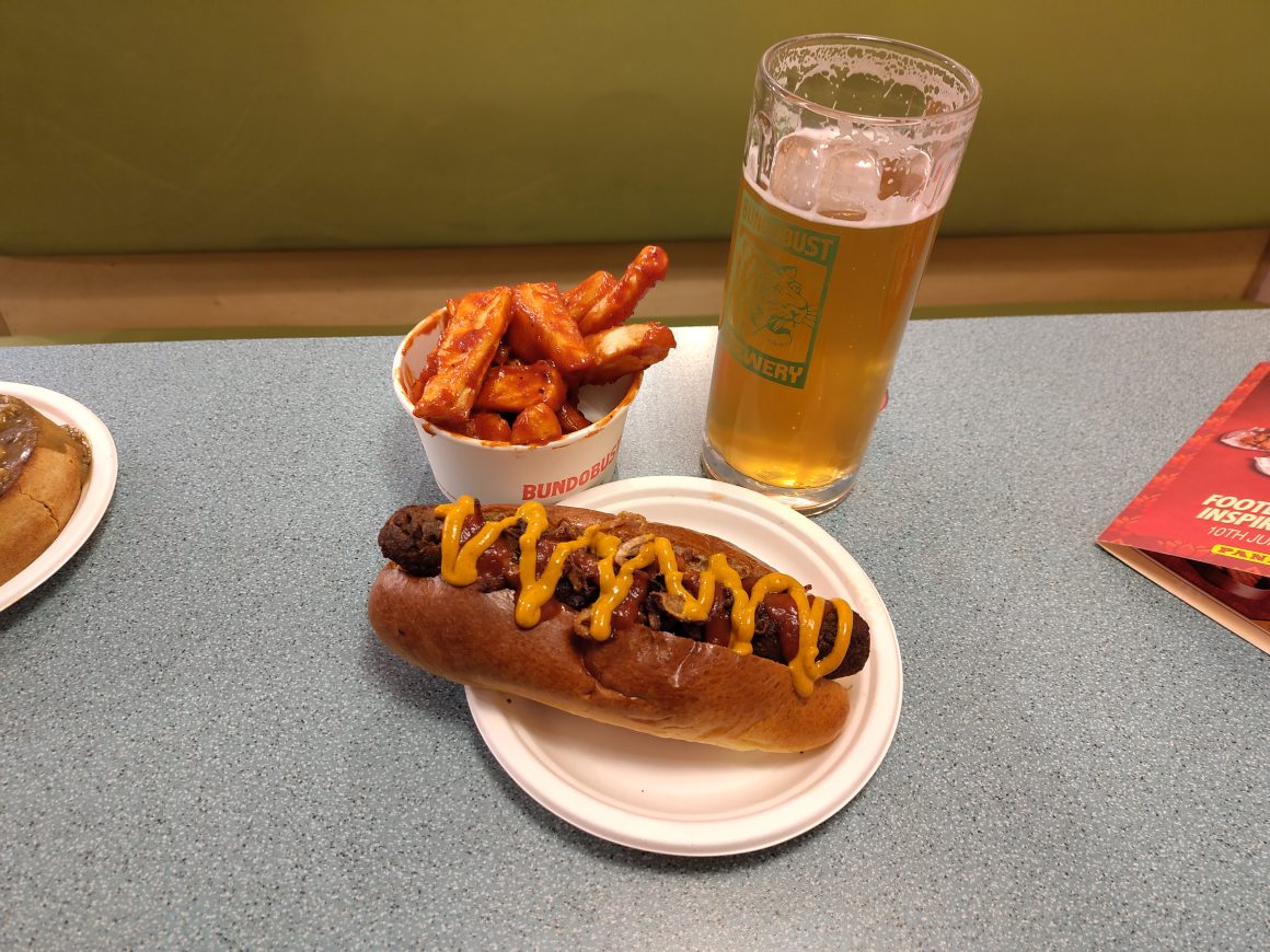 The Bundog is, as the name suggest, a Bundo-hotdog. The dog is a soy-mushroom mix, with a slightly dry and mealy texture not a million miles from a falafel. The sausage is served in a brioche bun with a liberal topping of curry mustard backed up by chilli ketchup, crispy onions and ‘Thums Up caramelised onions’ (with thanks again to Wikipedia, I know that Thums Up is an Indian cola). It’s good, and if you want something you can hold in one hand while jumping around in delight at a goal, this is the dish to go for, but for my preference it was a little dry. My pint of Shynee, a refreshing and tasty lightly hoppy lager brewed especially for this menu, was a good pairing here.