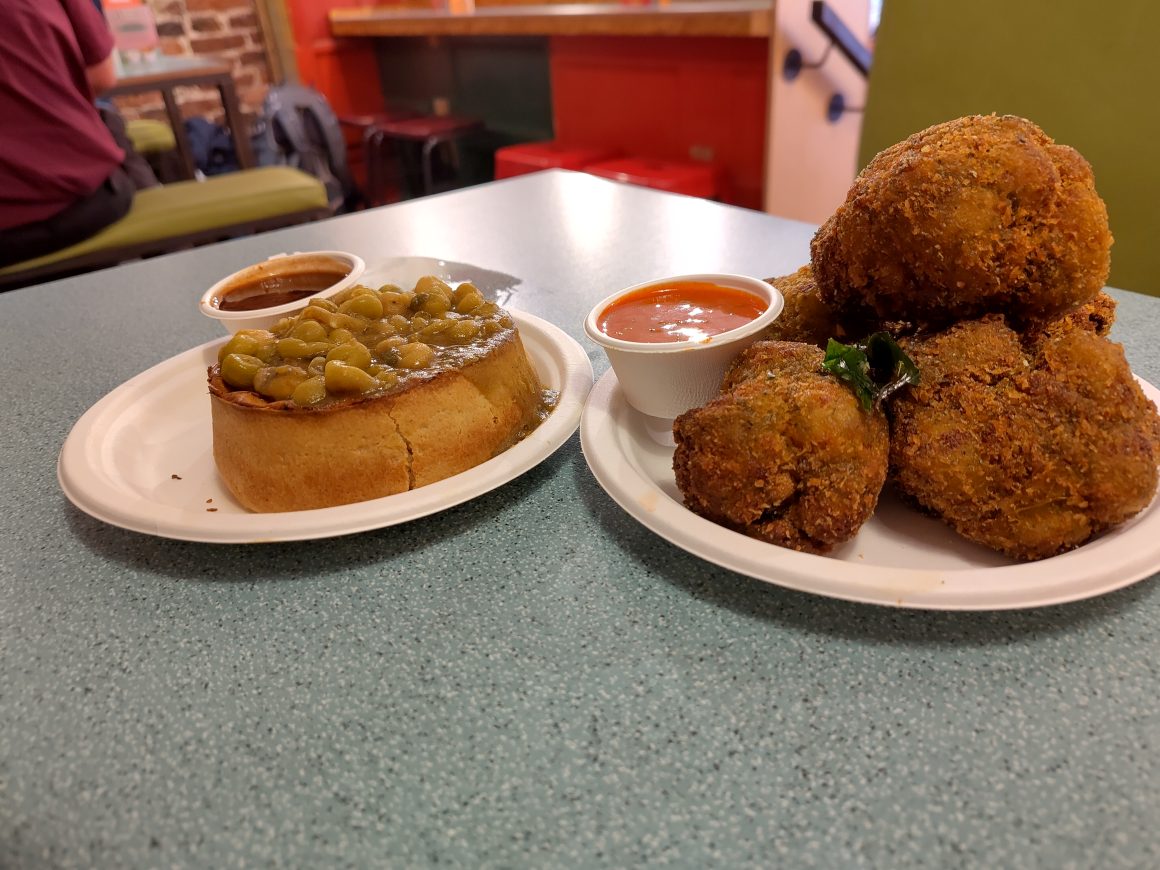 First of the specials is the Vindaloo Pie. Great North Pie Co. has provided the pastry, and it’s a proper pie shell with no messing about – sturdy enough to contain the filling without collapsing but slim enough to not be cloying. The vegetable vindaloo inside has a good amount of potato and punchy spicing, hot but not the ridiculous heat of old jokes about vindaloo. And what has to go on top of a football pie? Peas (even I know that!), in this case a layer of the mushy pea ragdha from the regular menu item ragdha pethis. To finish it off there’s a pot of desi gravy – in fact, much closer to brown sauce than gravy with its sweet tamarind acidity, just what the peas need to add zing. The pie can be upgraded to The Fat Les, meaning it is stuffed into a pav bread bun (in tribute to the Wigan Kebab) with added green and red pav chutneys.