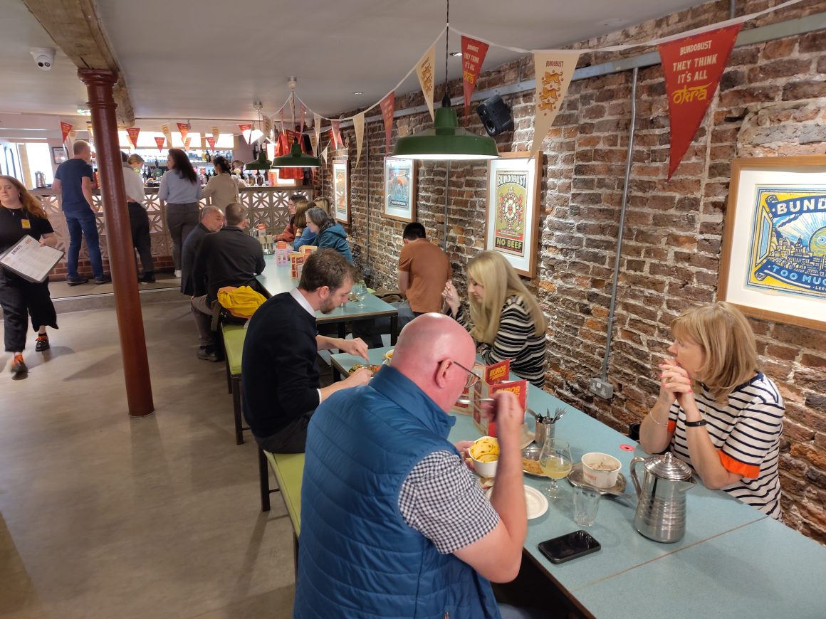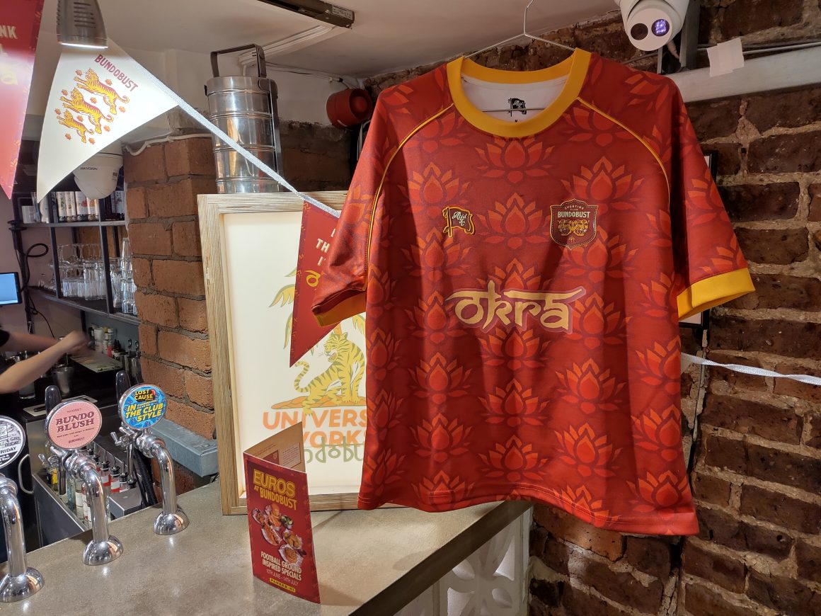In case the themed food isn’t enough, Bundobust has added a football shirt to their range of merchandise. Designed in collaboration with Acid FC, who also designed the current Leeds United kit, the shirt is a vibrant deep orange with yellow trim, and ‘sponsorship’ from okra. I’m goalkeeper-tall and built more like a football than a footballer, so there isn’t a size for me. The £75 price tag is as bold as the orange colour, but there’s a “they think it’s all okra” t-shirt at £15, too.