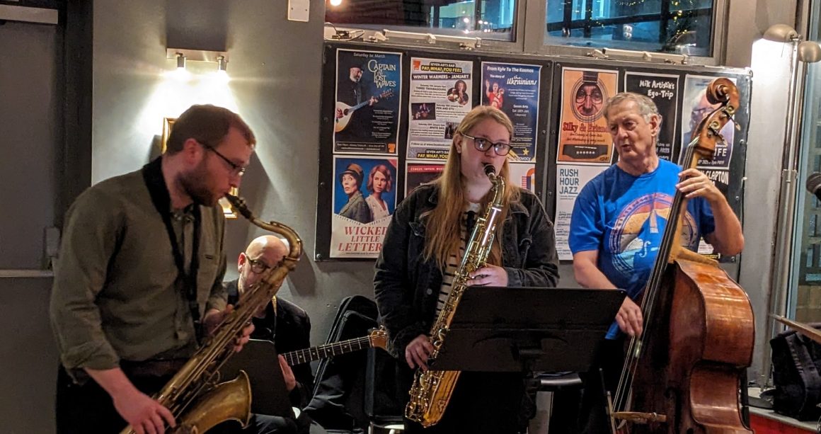 This was the first Jazz Leeds event of 2025, the first of over 100 events to be held in the coming year. Rush Hour Jazz sees local bands playing twice a month in the bar (or courtyard in summer) of Seven Arts in Chapel Allerton. This is the tip of the Jazz Leeds iceberg that includes afternoon and evening concerts, jazz jams, Leeds Jazz Festival and the Take Part outreach programme.