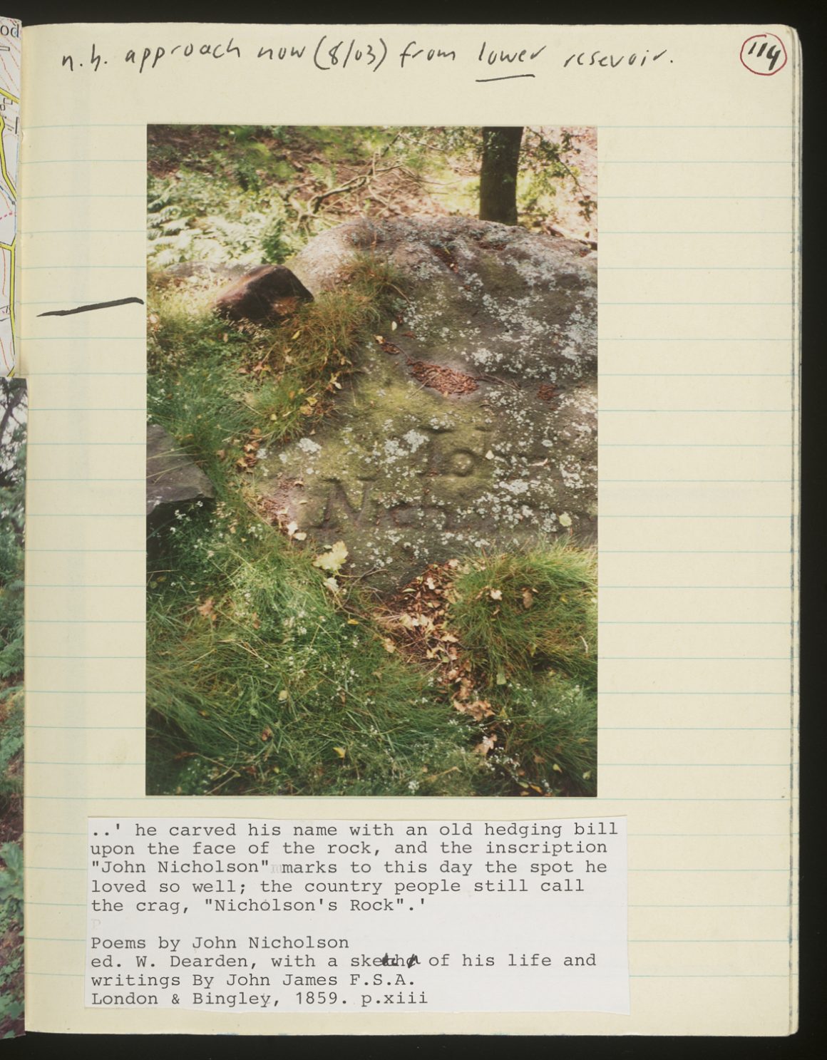 Recording his dogged traipsing around West Yorkshire, turning up only traces or absences, Harrison’s archive is also an ironic postscript to the life of Nicholson, who was so concerned with how he would be remembered. At around midnight on Good Friday 1843, the inebriated poet slipped on the stepping-stones in the River Aire as he returned to Saltaire, managed to extract himself from the river, but died on the bank. The stepping-stones themselves were removed shortly afterwards, and even his original grave site was lost – to the B6265 when it cut across the churchyard of All Saints in Bingley.